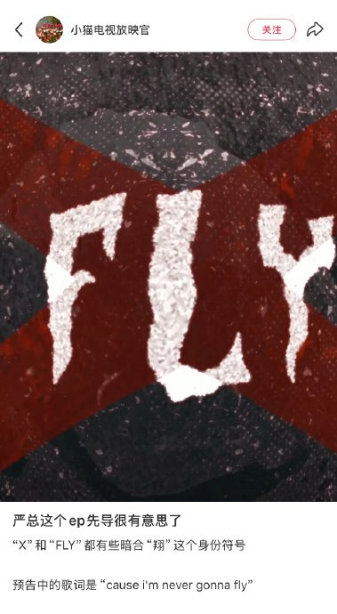 瞳孔占据整个画面,形成“被凝视”的压迫感。当观众被迫注视“FLY”符号时,实则经历与主角共同“凝视恐惧”的心理体验。特写镜头的侵略性消解了安全距离,使观众从旁观者变为叙事共谋,暗合EP“恐惧共生”的核心命题。