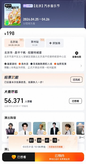2026年北京汽水音乐节今日正式开票!3月31日10点58分,这场春日音乐狂欢的门票在全平台同步开售,乐迷可通过大麦、猫眼等官方渠道抢购单日198元门票,更有千张免费门票抽奖活动持续进行中。