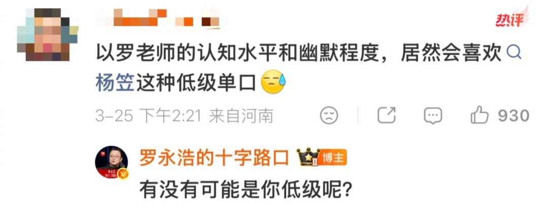 贬低杨笠的段子低级,质疑罗永浩的审美,老罗直接怼了回去:“有没有可能是你低级呢?”,甚至当众官宣自己就是杨笠的“铁粉”。