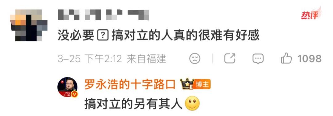 除此之外,罗永浩还回怼网友“没必要,搞对立的人真的很难有好感”的言论,表示搞对立的另有其人。