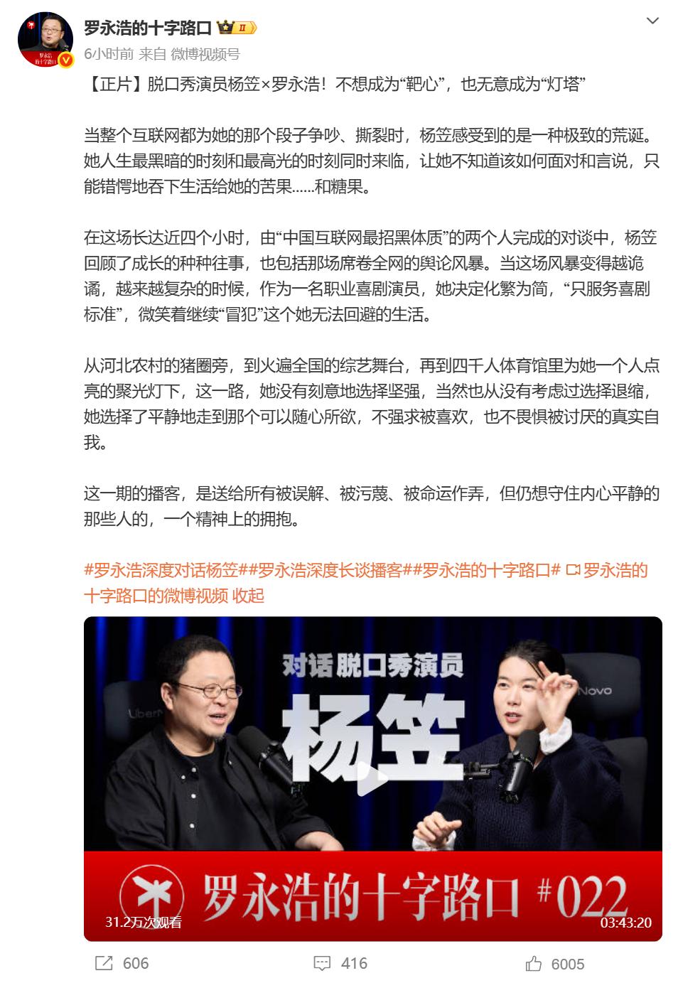 原来,罗永浩的播客《罗永浩的十字路口》最新一期,请来的对谈嘉宾不是别人,正是因“普信男”争议火出圈,去年11月一夜清空微博和抖音的杨笠。