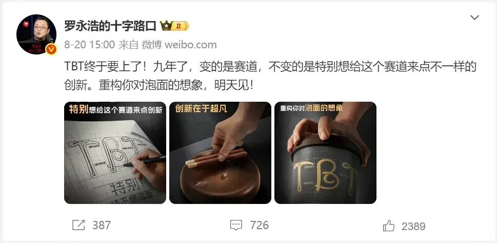 结果呢,悬念吊足了胃口之后,罗永浩终于揭晓了答案:TBT是“特别特”的拼音缩写,是康师傅的一款新泡面。而罗永浩的身份,是“TBT特别产品官”。