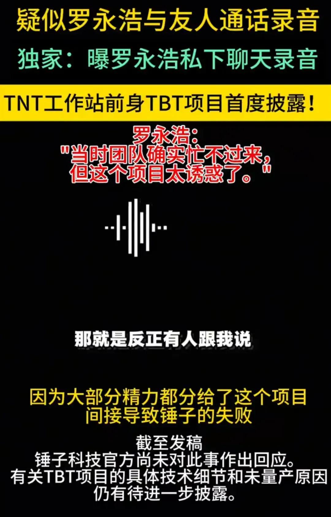 时间倒回2025年8月,当时罗永浩在网上流传出一段私聊录音,录音里说他九年前曾经秘密推进过一个叫“TBT”的创新项目,因为这个项目太有诱惑力,导致锤子科技分心,间接造成了后来的失败。