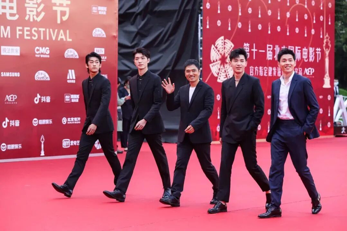 《五个扑水的少年》导演宋灏霖携“扑水少年”冯祥琨、李孝谦、王川、辛云来走上第十一届北京国际电影节开幕红毯。
