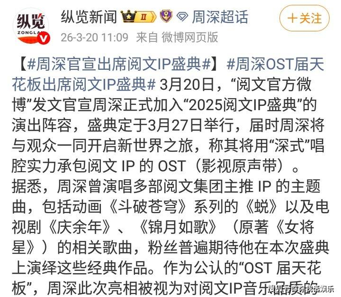引人关注的是,周深官宣出席阅文IP盛典消息,引发众多网友关注!纵览新闻发文,信息量好大!首先,第一个时间点,是3月20日。官宣周深正式加入“2025阅文IP盛典”的演出阵容。其次,第二个时间点,是3月27日。“2025阅文IP盛典”举行时间确定。周深到时候会演唱影视歌曲!最后,由浅入深,提及歌手周深曾经演唱多部阅文集团主推IP的主题曲。