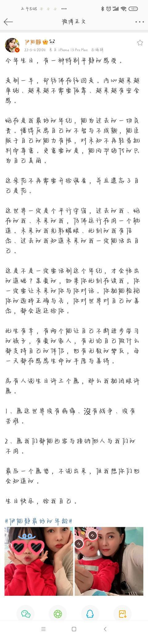 伊能静说,今年的生日,自己特别平静。走到一半,却彷佛在往回走。内心越来越单纯、越来越不需要依靠、越来越有安全感。现在是自己最好的年纪。能在54岁的年纪,看到自己身上的进步,足见伊能静是个善于总结和反思的人。