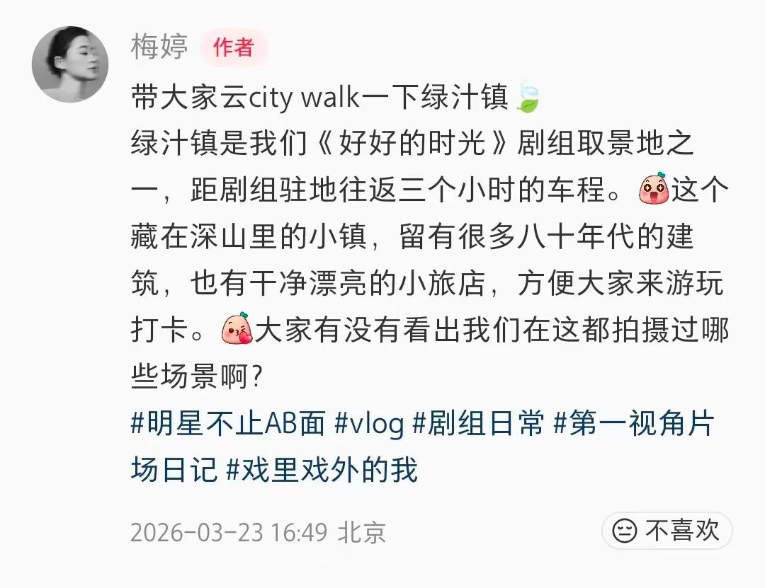 梅婷在小红书分享道:“绿汁镇是我们《好好的时光》剧组取景地之一,距剧组驻地往返三个小时的车程。这个藏在深山里的小镇,留有很多八十年代的建筑,也有干净漂亮的小旅店,方便大家来游玩打卡。大家有没有看出我们在这都拍摄过哪些场景啊?”