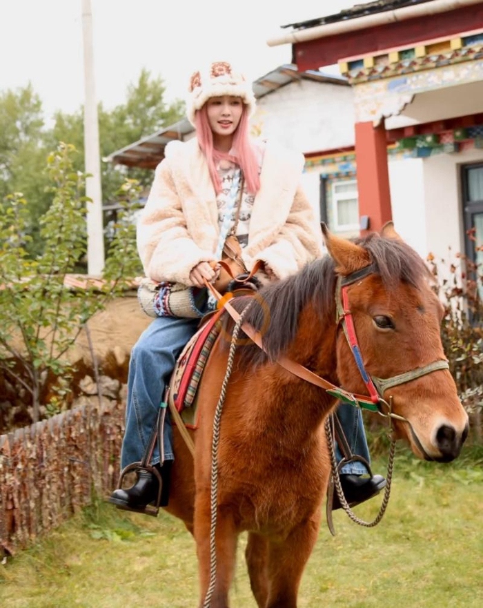 这份“度假感”藏着藏不住的元气,更藏着不矫情的敬业。谁能想到,在高原上蹦蹦跳跳的她,刚经历过生病暴瘦,身体还没完全恢复。骑马任务里,她摔了三次却没喊停,藏族向导都夸她“比去年来的艺人硬气”;即便下马时因高原反应踉跄了一下,稍作调整就立刻投入状态,反观一旁的李晨早已喘得直不起腰。为了贴合节目氛围,她特意染了限定款粉发,还透露新疆站会尝试新发色,这份用心让观众直呼“跑男捡到宝了”。