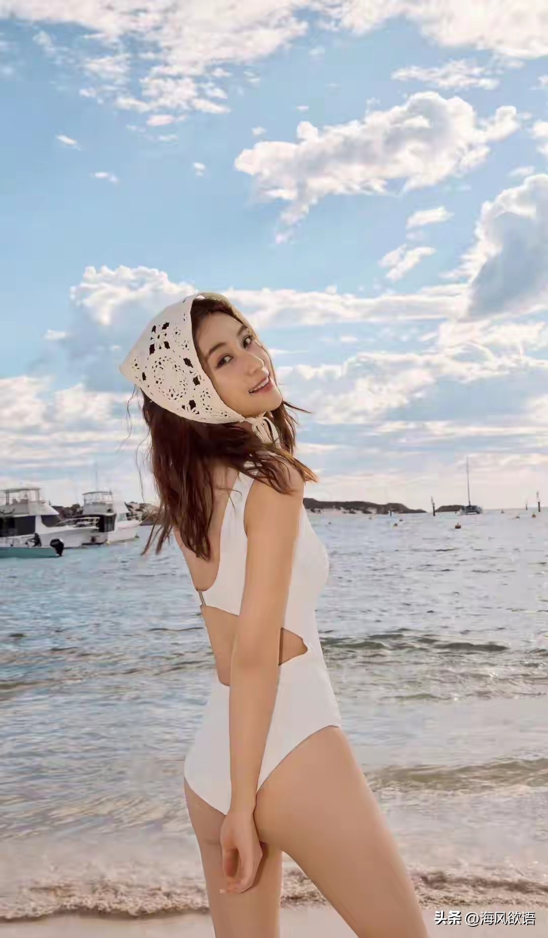 何超莲这组海边照真的太圈粉了!完全没有豪门千金的距离感,光着脚踩在沙滩上,一身简约白色连体泳衣,干净又高级,把好身材衬得恰到好处。