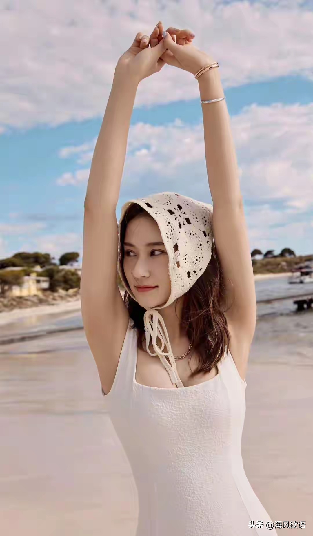 最妙的是头上那顶镂空针织帽,和泳衣同色系,慵懒又时髦,随便一站都是大片感。她全程笑容明媚灿烂,眼神轻松自在,没有刻意凹造型的僵硬,反而透着满满的松弛感。