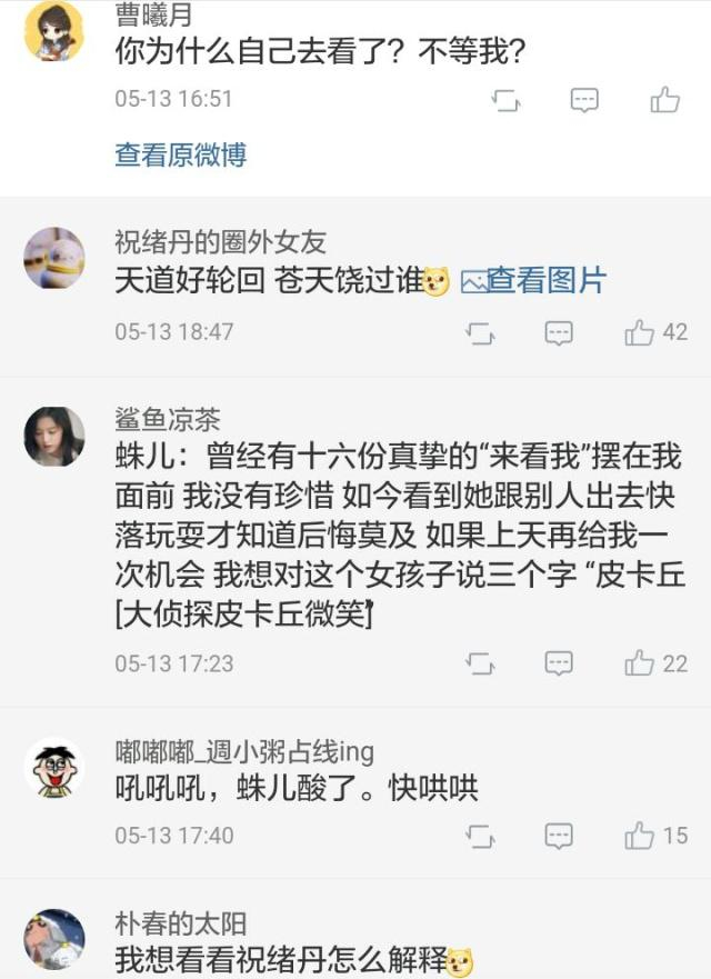 这次祝绪丹发“福利”,曹曦月依然第一时间来评论,“质问”她为什么不等她一起去看?说好了一起,你却偷偷的去?哈哈,网友也是调侃“蛛儿”酸了,还有的看热闹不嫌事大,说看祝绪丹怎么解释。可是祝绪丹什么也没说,估计给好姐妹发私信解释了吧?