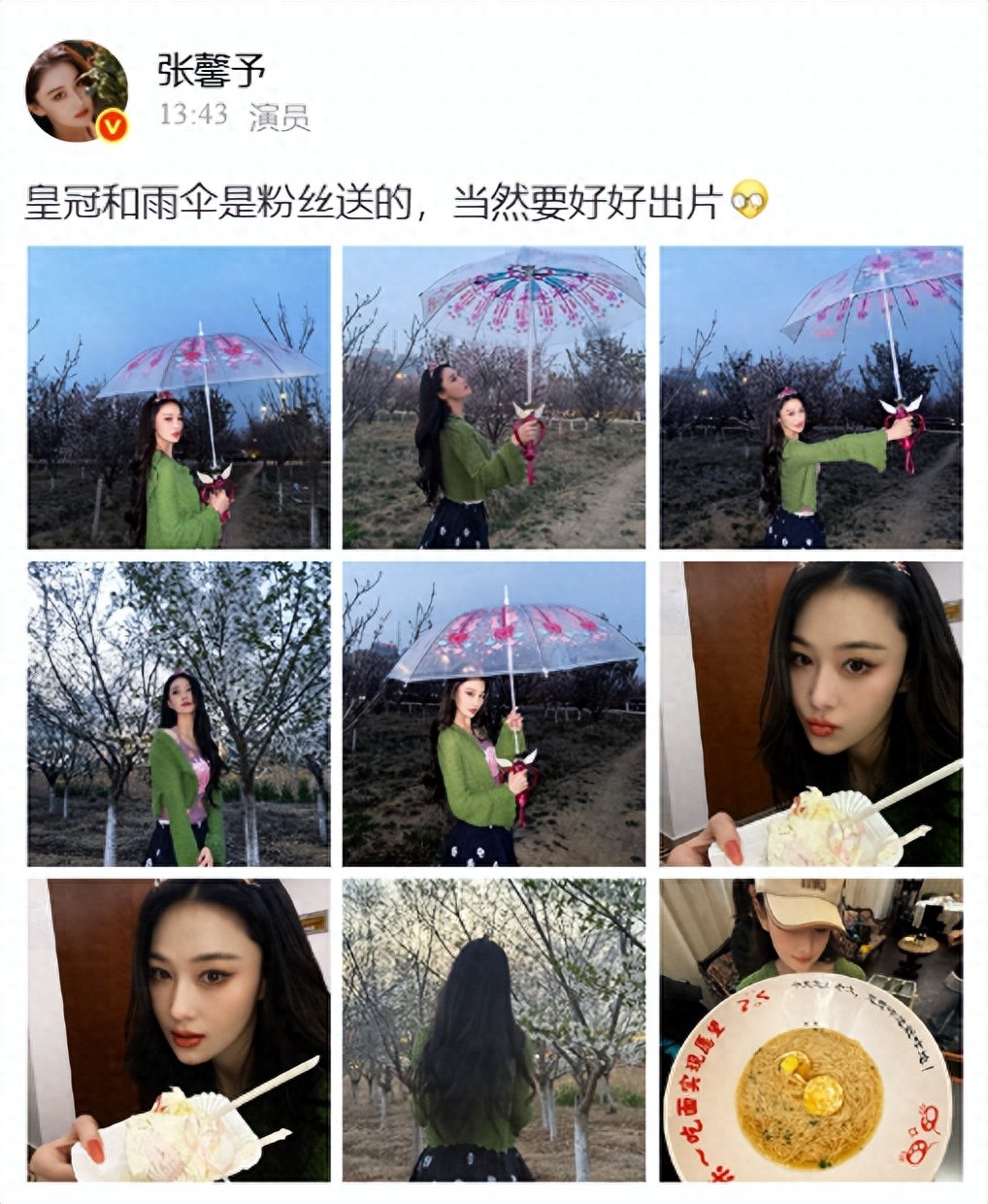在3月30日,张馨予在社交平台上晒出生日美照,还配文:皇冠和雨伞是粉丝送的,当然要好好出片,在一片樱花地里拿着魔法雨伞戴着皇冠像是城堡里的公主,而且还穿着紫色小肚兜陪着绿色针织衫美得好惊艳。