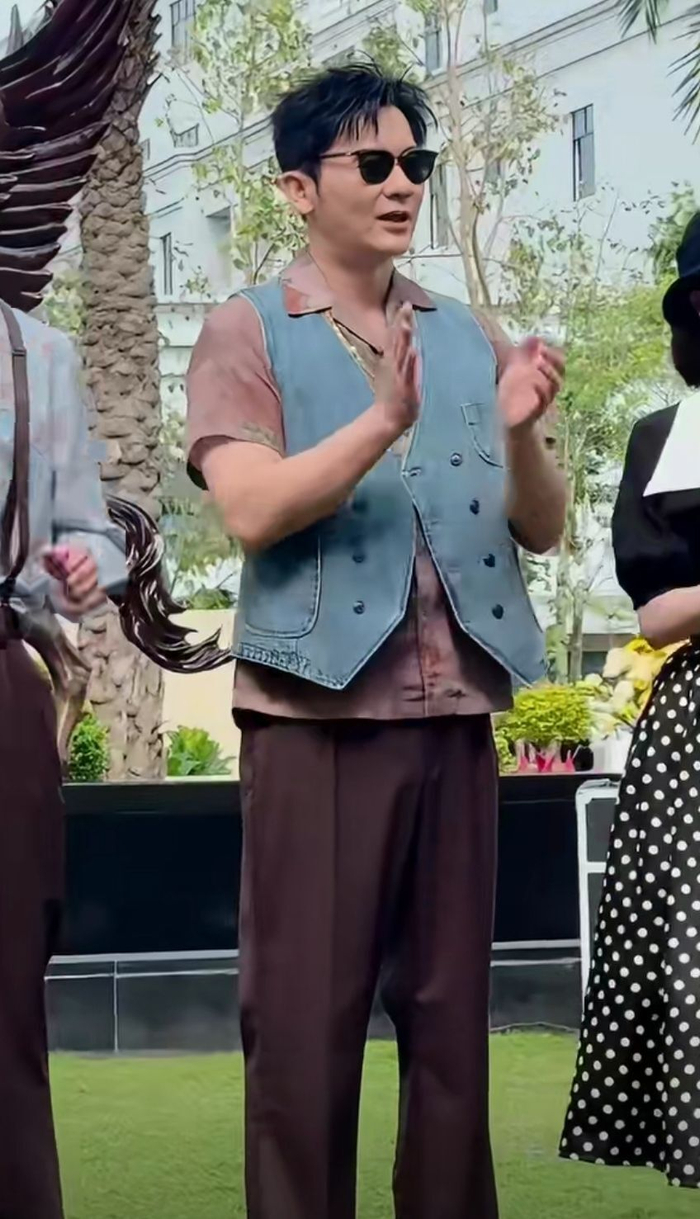 范丞丞这回的造型有点80年代街溜子的范儿,背心配花衬衫,再加阔腿牛仔裤,休闲又洋气。