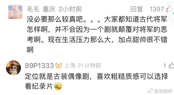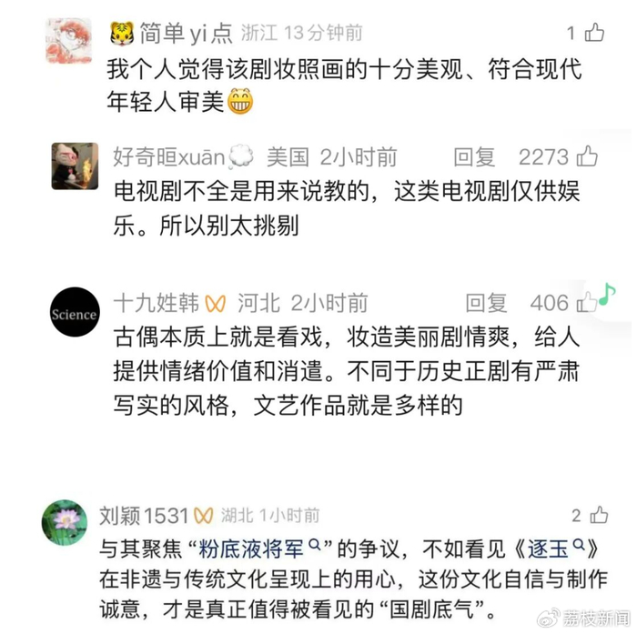 当然,当《逐玉》引爆全网的时候,也有观众吐槽男主角色塑造成了“粉底液将军”。“6点钟起来演戏,4点钟起来打粉”,认为形象过于阴柔、俊美,有违人们传统印象中的武将形象。