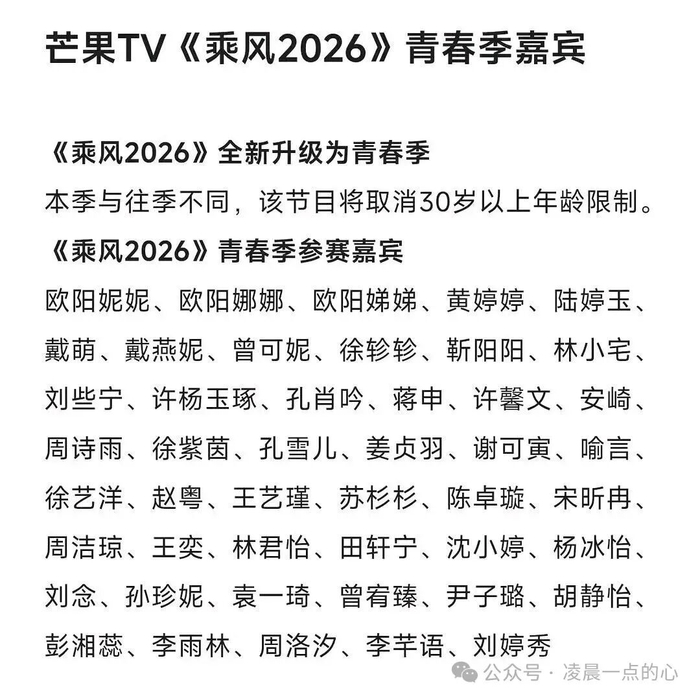 ## 吃瓜一文:乘风2026的传闻,老粉们心中期待与忧虑,乘风2026的消息一出,老粉们仿佛都被惊到了,传闻中,这部曾经以“聚才如集公子”的风采闻名的综艺,竟要取消年龄限制,打造青春季?这可真的是“打车去地铁,打个喷嚏还差点没把遮阳伞拍翻”的级别啊。,作为曾经的老粉,看到节目组这次的举动,真是忍不住为“乘风破浪的姐姐”系列感到一丝酸涩,想起那些风风火火的才子才女们,谈论着各自的领域,互相帮助,共同成长的画面,真的是让人怀念,那些风采出众的嘉宾,不仅仅是因为长相好看,更是因为他们各自在各自领域有着闪光的光芒,他们的故事感人,歌曲动听,版权丰富,这才是“乘风破浪”的精髓啊。,可惜的是,今年的传闻似乎让人看到了一些不一样的风向,邀请了很多创造营和青春有你里的偶像,这么一来,老粉们忍不住怀疑,节目组是不是已经把“乘风破浪的姐姐”这个品牌给“卖光”了?难道想把节目变成一个选秀式的青春狂欢派对吗?这可是不行的啊,毕竟“选秀”这个词,总是让人联想到《创造101》《加油中国》这样的节目,完全不符合“乘风破浪”的本质。,作为老粉,我真希望节目组能继续坚持最初的初衷,邀请那些30岁以上的姐姐,毕竟她们的生活经验丰富,谈吐不错,能带来真实而有深度的故事,不要让节目变成一个“回锅”的舞台,不要让嘉宾为了节目而四处旅游,也不要让她们在户外活动中“瑟瑟发抖”,老粉们都希望看到的是,嘉宾能够在这个平台上,真正突破自我,展现出更多的才华和潜力。,至于张曼玉的传闻,老粉们真是又惊又喜,假设这是真的,那可真是个大新闻啊,张曼玉作为一名资深的主持人和歌手,她的加入不仅能为节目增添专业的气质,更能带来更多的高质量内容,希望节目组能听进老粉们的心声,把节目变得更好,不要偏离原本的初衷,让“乘风破浪的姐姐”系列再度绽放光彩。**乘风2026:取消年龄限制,打造青春季?还是变成选秀舞台?**,关于《乘风破浪》2026年版的消息引发了热议,尤其是节目取消年龄限制,打造“青春季”,邀请创造营和青春有你里的偶像参加,这个消息让很多观众感受到了既兴奋又复杂的心情。,回想一下,原版《乘风破浪》以“姐姐风暴”为核心,邀请30岁以上的女性嘉宾,讲述她们在生活中的奋斗故事,打破自我、追求卓越,风靡了整个网络,这种“姐姐风暴”不仅是节目的一大特色,更是对社会现实的深刻洞察,观众们对她们的支持和喜爱也无可厚非。,这次节目取消年龄限制,邀请年轻偶像参加,是否能保持原有的魅力?这不禁让人怀疑,节目是不是在悄悄变成了选秀节目?毕竟,原版的成功在很大程度上得益于“姐姐”的独特性和生命力,而年轻偶像虽然也有自己的优势,但与“姐姐风暴”的独特气质还是有很大差距。,也有人认为,这可能是节目组根据现实需求做出的调整,随着社会年龄结构的变化,30岁以上的女性嘉宾群体正在减少,邀请年轻偶像或许能吸引不同年龄层的观众,增加节目的活力和年轻感,但另一方面,这也可能让原有的观众感到失望,毕竟大家期待的是那些经历过风风雨雨后依然保持风采的“姐姐”。,在这次调整中,用户的期望声音也不容忽视,有人希望节目坚持“姐姐”的核心,继续邀请30岁以上的嘉宾,打造“乘风破浪”的独特风采,也希望节目能拿到更多歌曲版权,唱一些好听的歌曲,减少户外采访,避免嘉宾辛苦等等。,至于乘风2026的具体嘉宾阵容,传闻中有张曼玉参加,这让人既期待又好奇,如果是真的,那么这届嘉宾的表现会是全新的风景,但如果只是传闻中的谣言,那么我们还是得看看节目组的真实动向。,《乘风破浪》作为一个经典节目,其核心在于嘉宾的真实性和独特性,如果能在取消年龄限制的同时,找到合适的嘉宾阵容和节目方向,或许能让观众看到新的风采,但如果只是为了流量而改变初衷,那么这次调整或许会让原有的观众感到些许失望。,不管怎样,乘风2026的消息确实值得期待,希望节目能在调整中找到平衡,既保持原有的魅力,又能吸引新的观众,毕竟,真正的“乘风破浪”不仅仅是风格的变迁,更是对观众期待的回应。