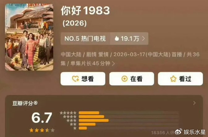 今日,周也、翟潇闻主演的年代穿越创业剧《你好1983》正式在豆瓣开启评分,初始开分锁定6.7分,处于中等偏上水平,既未达到观众对优质年代剧的预期,也未陷入口碑低谷,评分背后是观众对剧集亮点与短板的集中反馈,呈现出明显的两极分化态势。