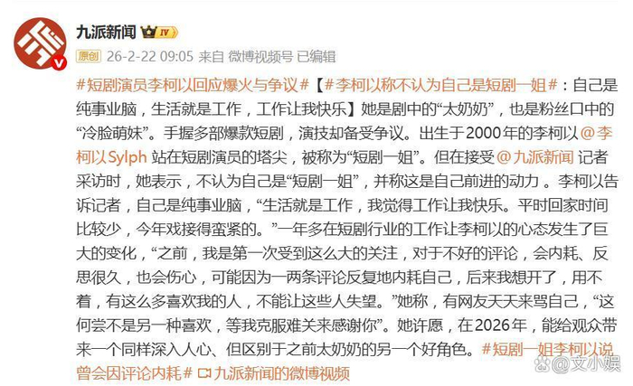 ## 00后"太奶奶"的自我救赎之路:一个"吃瓜"的成功案例,在这个流量至上的时代,"短剧一姐"的称号就像一张 Convenience 运算券,轻易就能换取一位演员的光辉人生,站在风口浪尖的李柯以,选择了一个让人"吃瓜"不已的方式——坦白"我不认"。,这位"太奶奶"的主角,以非典型的方式走红,从北京服装学院毕业的非科班出身,到早期略带"婴儿肥"的外形,她吃尽了各路大神的唾骂,记得最初的日子里,她曾深陷内耗,看到恶评会反思、会伤心,甚至因为一两条评论反复内耗自己,可是在这个快节奏的行业里,"内耗"根本不是路子,2025年4月到12月,她仅休息了20多天,日均工作超过10小时,这种忙碌成为了对抗焦虑的解药。,现在的她,已经练就了"强心脏",面对依然存在的负面评价,她甚至能调侃道:"天天骂我的人,何尝不是另一种喜欢?等我克服难关来感谢你。"这种从"被评论支配"到"用作品说话"的蜕变,堪称现代明星的必修课。,在这个流量来得快、去得也快的时代,李柯以的"不认"不是谦虚,更像是一种战略性的自我救赎,她的"短剧一姐"不是一种身份认同,而是一种身份的祛魅,这种反骨思维,在流量至上的娱乐圈里,堪称异乎寻常。,演员的核心竞争力不在于流量的高度,而在于稳定的产出能力,李柯以的"破局之战",或许比任何头衔都更值得期待,下一次,她带来的,会是另一个"爆款模板",还是一个真正的"突破角色"?这场自我救赎的战争,既是对流量时代的无声抗争,也是对演员本质的坚守。,看来,在这个饭圈化的娱乐圈里,真正值得"吃瓜"的,不仅是那些"太奶奶"的反差风采,更是那些敢于打破流量标签、追求演员本质的选择,李柯以的"我不认",恰恰是一种另类的认同,是她与这座快节奏时代的和解,也是她对演员本质的坚持。