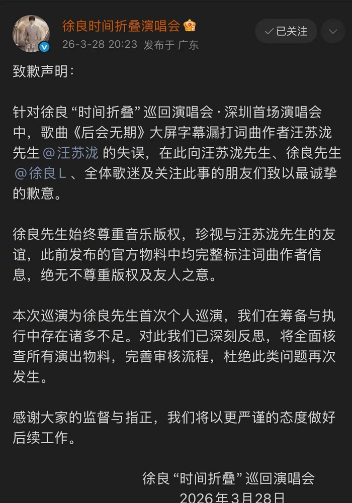 搜狐娱乐讯 28日,“徐良时间折叠演唱会”官方账号就深圳首场演唱会中,歌曲《后会无期》大屏字幕漏打词曲作者汪苏泷的失误,向汪苏泷、徐良、全体歌迷及关注此事的朋友们道歉,后续将全面核查所有演出物料,完善审核流程,杜绝此类问题再次发生。