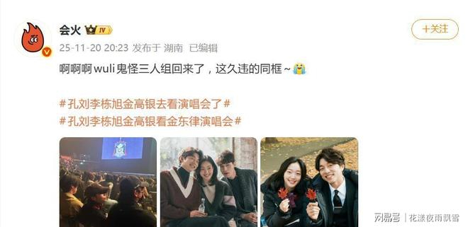 现场细节更是让“鬼怪”粉狂喜。三人座位紧密相邻,金高银坐在中间,孔刘与李栋旭分坐两侧。这个熟悉的布局,被眼尖的网友一眼看穿,完美复刻了剧中“鬼怪-新娘-阴间使者”的经典三角关系。此前关于他们“分开就座”的猜测被现场粉丝通过屏幕反光彻底击破,证明了这次同框是有意为之的“团建”。