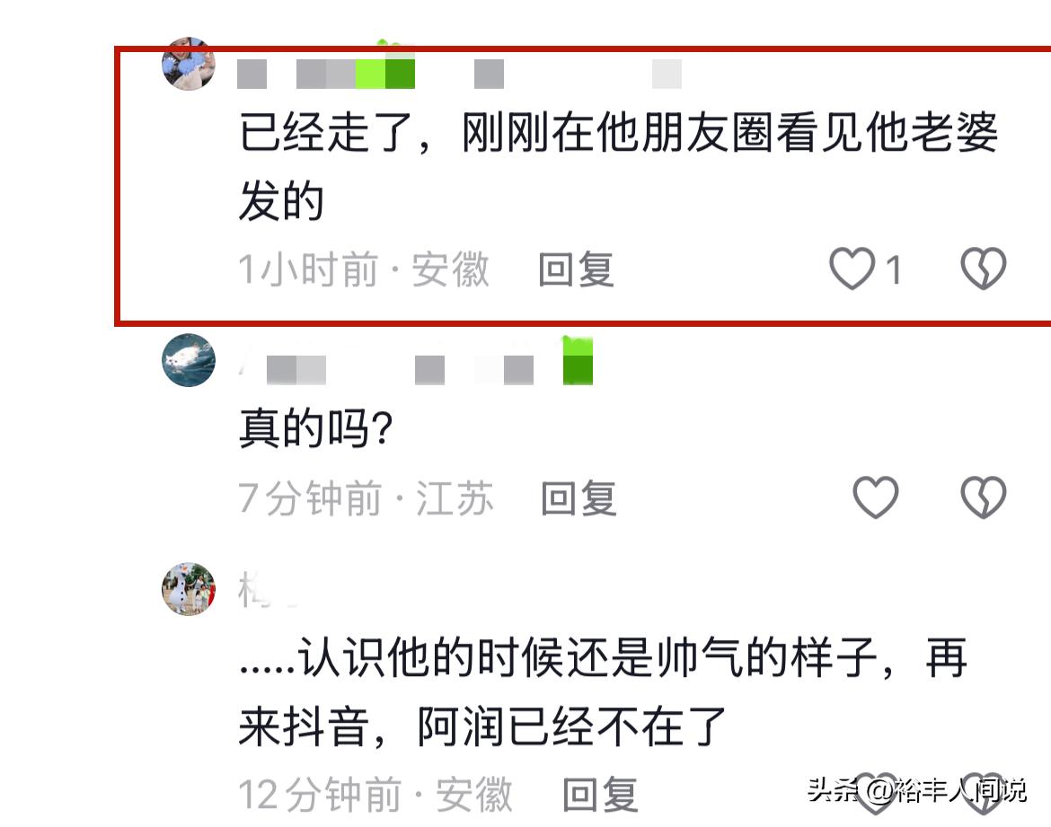 据了解,这一消息并没有在其视频账号上公开,但在群聊中,阿润的妻子已经公开噩耗:润哥走了,请你们带着他的遗憾,继续加油。