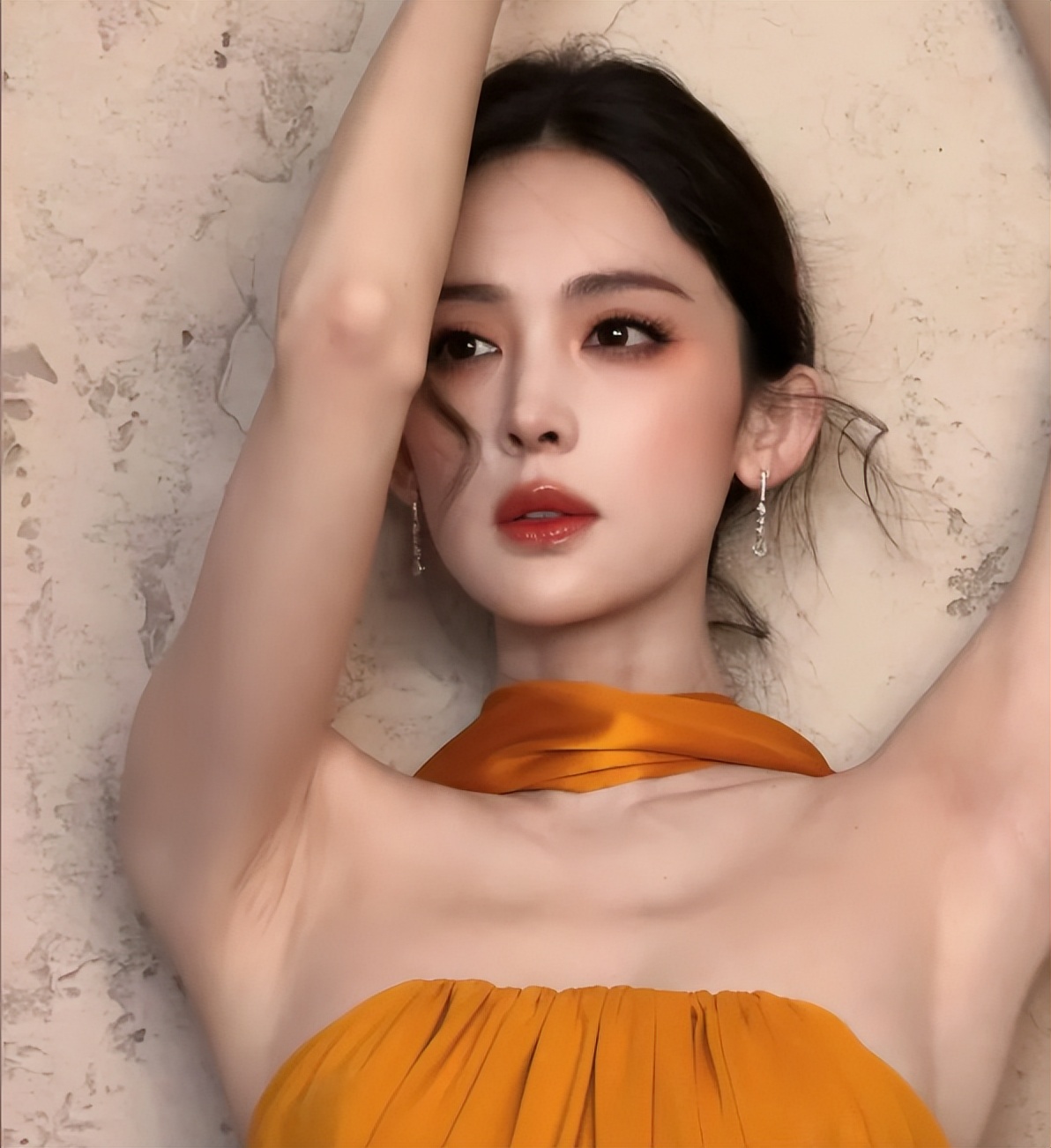 近距离看她的脸,皮肤白得发亮,细腻得看不到一点毛孔,眼妆很淡,只勾勒了浅浅的眼线,唇色是低饱和的豆沙色,衬得气色特别好,眼窝深邃,鼻梁高挺。