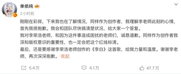 该喊话很快引发舆论围观,随后单依纯发文回应并向李荣浩致歉。单依纯表示,首先我很抱歉,我会和团队尽快搞清楚状况给大家一个答复。同样作为创作者我深知版权意识的重要性,也一定会把这个红线标清。