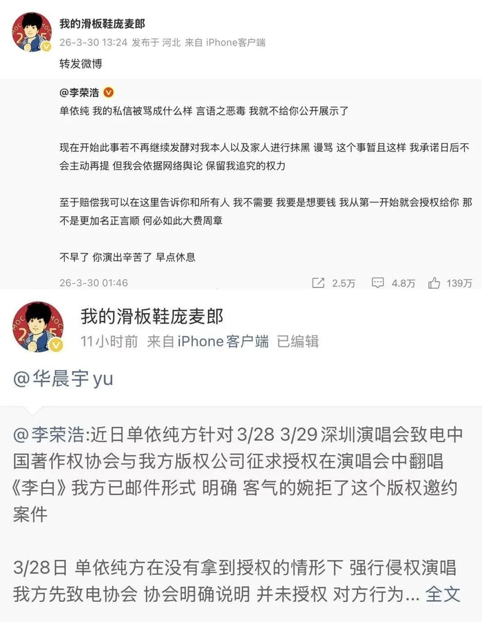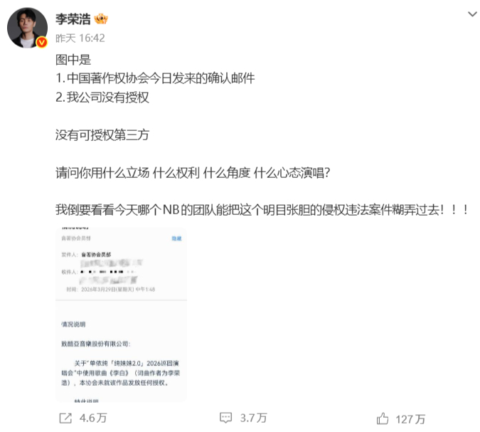 但李荣浩不一样,他没授权单依纯在演唱会上唱《李白》,结果人家还是翻唱了。他要维权,公开声讨,然后被骂。