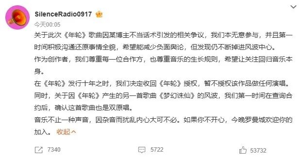 遗憾的是,太多的人在网络时代产生一种错觉,以为“破圈=价值”,忽略了某个歌手或某种作品的生命周期究竟有多长?还有人喜欢用“如何呢?又能怎?”挑战版权拥有者的忍耐底线,最后沦为一个时代的过江之鲫。