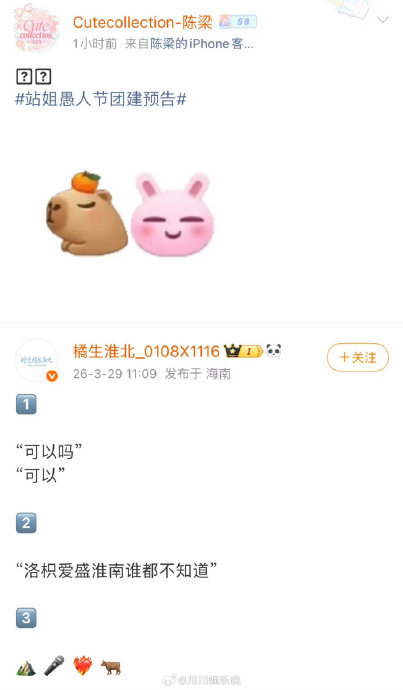 "站姐团建 橹穆流水席"是2026年愚人节期间内娱粉丝圈的一场大型联动活动,本质是站姐(明星应援账号运营者)打破常规发图规则,跨界集中发布人气CP组合"橹穆"(王橹杰与穆祉丞)的高质量照片、视频等物料,形成刷屏式"流水席"狂欢。