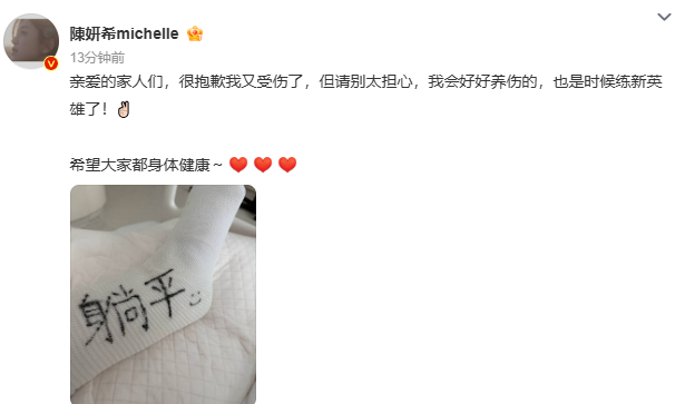 随后,陈妍希在个人社交账号也发文回应:“亲爱的家人们,很抱歉我又受伤了,但请别太担心,我会好好养伤的,也是时候练新英雄了!希望大家都身体健康。
