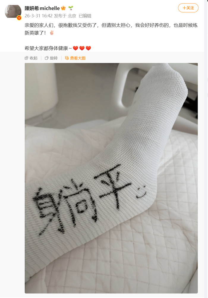 3月31日,陈妍希工作室发文,称昨日陈妍希在进行运动训练时不慎发生意外,导致跟腱断裂。意外发生后,工作室第一时间陪同艺人前往专业医疗机构进行全面检查,目前已完成应急治疗,医生已为其完成手术并制定了详细的康复治疗方案,艺人现阶段需严格遵照医嘱静养休息,减少活动,配合后续康复调理。