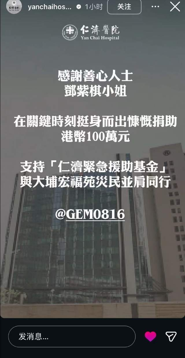 灾难发生后的48小时内,邓紫棋完成两次精准援助。11月28日,她通过仁济医院「紧急援助基金」捐赠100万港币专项支援灾民医疗安置;次日又现身东华三院慈善晚会追加100万港币。这笔累计200万港币的善款背后,是她台前幕后截然不同的两种姿态:社交媒体静默无声,救援行动却雷厉风行。