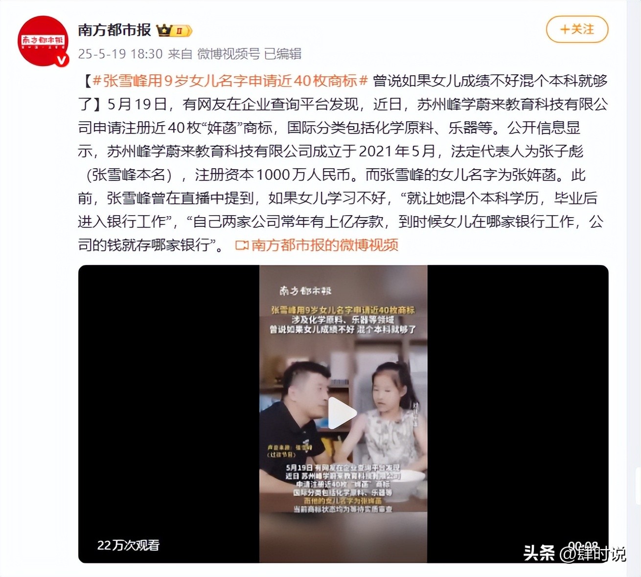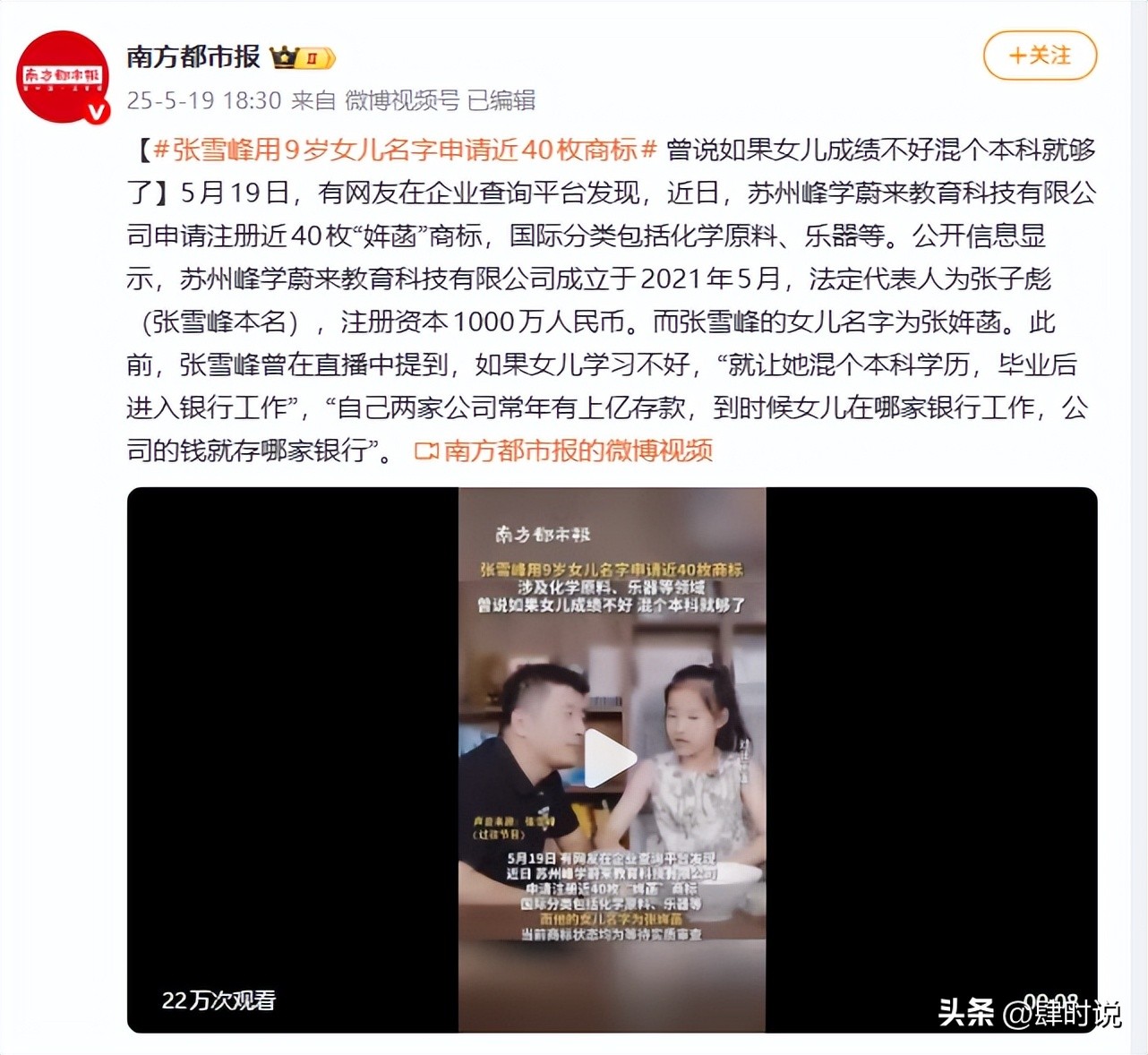 南方都市报 2025-05-19——【#张雪峰用9岁女儿名字申请近40枚商标# 曾说如果女儿成绩不好混个本科就够了】