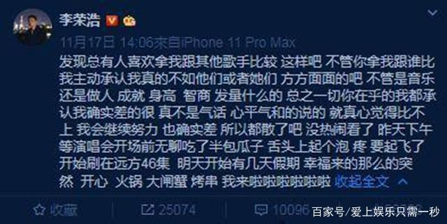 事情的发展也是让李荣浩自己困扰不已,在博文中他也是很谦虚的认为自己还是需要努力,也恳请大家不要拿他和其他歌手比较,如果大家认为谁比他更有才华,那么他就自认不如那个人。