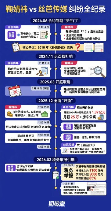 **吃瓜简评:鞠婧祎税务举报事件,一个税风生死簿的娱乐大戏**,2026年3月30日,一则“检举税收违法行为接收回执”在全网引爆,鞠婧祎与老东家丝芭传媒的合约纠纷被推向了税务举报的“生死局”,这场闹剧不仅涉及钱财与法律,更像是一场现代娱乐圈的“权力博弈大戏”。,### **一、矛盾的根源:合约纠纷引发的“生死簿”**,2024年6月,鞠婧祎宣布与丝芭传媒的十年经纪合约已到期,否认了2033年延长的补充协议的存在,丝芭传媒却死撑地出示补充协议,坚称合约有效至2033年,甚至动出手段进行司法笔迹鉴定,结果却是“签名真实性无法确认”,但这场“鉴定闹剧”并未解决根本问题,双方的合约效力争议仍然悬而未决。,### **二、冲突升级:从法律诉讼到税务举报**,2025年9月,税务部门首次收到关于鞠婧祎的涉税举报线索,但核查后并未发现问题,2025年12月,丝芭传媒突然发表《最后告知》,指控鞠婧祎“涉嫌严重经济犯罪”,并威胁要实名举报,这一举动背后,丝芭传媒显然是在用“大锤子”震慑鞠婧祎,试图在合约纠纷中占据上风。,2026年3月26日,丝芭传媒又发表声明,否认与鞠婧祎和解,矛头竟然指向鞠婧祎主演的新剧《月鳞绮纪》,称其试图“误导监管获取播出许可”,这下,双方的矛盾已经完全升级,丝芭传媒不仅在法律战front上打,还是在舆论战front上加码。,3月30日,这场博弈达到关键节点,丝芭传媒向国家税务总局递交实名举报信,指控鞠婧祎2024年偷税漏税,举报材料中称,鞠婧祎全年申报收入仅110.18万元,但2024年6月至12月的影视和商务活动实际收入却超过500万元,瞒报比例高达88%(差额近390万元),更令人咋舌的是,举报还附上了具体的收入明细表,月鳞绮纪》片酬160万、杂志拍摄单笔110万等等,仿佛是在“举报”自己的收入来源。,税务部门随后出具受理回执,启动了稽查程序,这一回执的出具,让鞠婧祎方当场“脸红”,因为此前他们一直在强调自己“已完成税务抽查”,并全盘否认偷税漏税的指控。,### **三、激化点:新剧定档与举报动机的“鱼死网破式博弈”**,举报信曝光的当天(3月31日),鞠婧祎主演的新剧《月鳞绮纪》宣布定档4月1日播出,这个定档时间点绝不是巧合,丝芭传媒一派“精准狙击”的说法,鞠婧祎方则一脸无辜,称此为“维护税收秩序”的举措,公众的智商并非一般人,很快就读出了这场博弈的规律:这不过是双方在合约纠纷中的一次“鱼死网破式博弈”。,### **四、法律与行业影响:税风生死簿的两大阵营**,从法律层面来看,如果偷税坐实,鞠婧祎将需要补缴税款、滞纳金以及.5-5倍的罚款,甚至面临刑事责任(如逃税额超过30%需判3-7年),若首次违法且及时补缴,也有可能免去刑责,至于丝芭传媒,作为前经纪公司,他们是否尽责代扣代缴,也将成为一个问题。,从行业影响来看,这场事件暴露了艺人工作室收入透明度的漏洞,凸显了“高分成、长合约”模式的结构性矛盾,金税四期监管下,艺人税务合规已经成为不可逾越的红线,但在这场博弈中,双方都在试图突破这一红线,以获取更多的主动权。,### **尾声:未解的博弈**,截至2026年3月31日,税务部门的通报并未认定鞠婧祎违法,但丝芭传媒手握举报回执仍在坚持追责,而鞠婧祧方则以法律诉讼为盾,宣布已委托律师起诉丝芭诽谤,新剧如期播出,两派阵营的核心矛盾——合约效力归属——仍待司法裁决。,公众的关注点不应仅仅停留在“88%瞒报”这一数字上,而是要看清楚这场博弈的本质:这是一场裹挟税务合规、资本控制与艺人自主权的内娱博弈,丝芭传媒以举报为刃,直刺艺人独立发展的命门;鞠婧祎以声明为盾,捍卫清誉与事业主权。