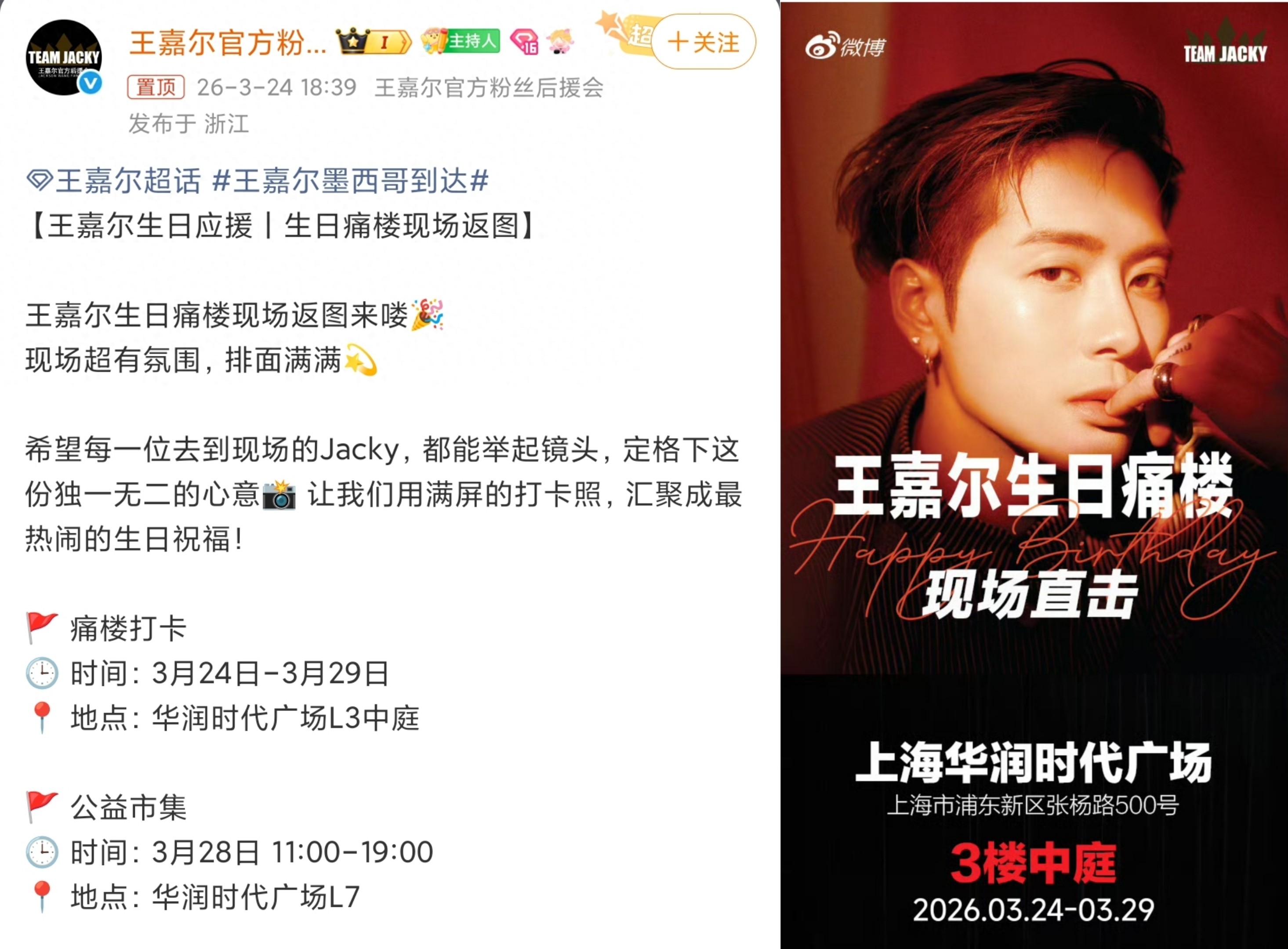 **王嘉尔32岁生日“痛楼”应援:全国排面拉满却惹争议,这波操作真是太会了!**,说到粉丝和偶像的互动,一定要提到王嘉尔的生日“痛楼”应援!这次活动简直是“全民狂欢”的代名词,全国各地的核心商圈都点燃了“热浪”,连带全国网友都在热议,真是气氛十足!,从3月24日开始,上海、广州、深圳、武汉、长沙等地的粉丝们齐心协力,搞了一场“微博痛楼”大型线下庆生应援,活动从跨楼层的巨型吊幔、满铺的高清海报,到专属互动装置和公益市集,整个场面简直是“视觉暴力”级别的!上海主场在华润时代广场,四层楼高的吊幔直接从顶部垂下来,粉丝们说刚进商场就能感受到“扑面而来的氛围感”,这画面感真的太强了。,更让人感动的是,活动特别设置了公益市集,所有盈利都捐给公益项目!去现场的粉丝都说,刚进商场就能感受到“扑面而来的氛围感”,L3中庭整层都铺满了王嘉尔的高清海报,横跨四层楼的巨型吊幔从商场顶部直直垂下来,视觉冲击力特别强,现场还专门设了互动机器,粉丝可以上传自己的照片,定制印着王嘉尔主题元素的专属痛水,这机器前几乎就没断过人,常年排着几十人的长队。,虽然活动声势拉得很足,相关话题刚上线就冲上了社交平台热搜,引来全网网友的围观和讨论,但这场看起来很圆满的庆生活动也没能逃脱争议,深圳场就有粉丝发现,商场在痛楼活动的举办期间,还加了其他艺人的随舞环节,这件事被发到网上之后,很快就引来了很多粉丝的不满,有粉丝直接发帖质疑,说大家投入了这么多的时间、金钱和精力,就是想给王嘉尔做一个专属的生日空间,商场私自加其他艺人的环节,完全背离了这场生日应援的初衷,也是对大家心意的不尊重。,原本定在成都宝山天街的“痛街”应援活动,也因为场地的问题临时取消了,只能改成其他形式的应援,不少提前做好了打卡准备的粉丝,都觉得特别遗憾,还有其他网友也提出了自己的看法,说线下应援的规模太大,很可能会影响商场的正常运营,还有其他市民的逛街体验,也呼吁粉丝应援要把握好边界,不要给别人添麻烦。,长期研究饭圈文化的中国传媒大学新闻学院李然副教授对这次活动给了高度评价,她说,这几年国内的粉丝应援模式已经完成了多次升级,从最开始的户外大屏、灯牌应援,到现在这种沉浸式的痛楼应援,本质上是粉丝情感表达需求的升级,痛楼源自日系痛文化,核心是用喜欢的元素打造专属沉浸式空间,能最大程度让粉丝感受到和偶像的同频共振。,李然也肯定了这次活动的公益属性,她说以前很多人对饭圈应援的印象是铺张浪费、盲目攀比,但现在越来越多的粉丝把庆生和公益结合,把流量转化为做公益的动力,既表达了自己的心意,又做了有意义的好事,这才是偶像能带给粉丝的正向力量,而针对活动中的争议,李然表示核心矛盾是粉丝的专属感诉求和商场的流量需求错位,粉丝要的是偶像专属的生日氛围,而商场想借活动吸引更多客流提升营收,诉求不同自然会引发矛盾。,她还提醒,线下大规模应援有很多不确定性,粉丝要提前和场地方做好充分沟通,明确权责和活动边界,避免出现预期不符的情况,同时也要引导粉丝理性应援,量力而行,不搞非理性消费和攀比,遵守公共场所规则,不影响他人的正常生活。,这场有排面、有温度,却也带着不少争议的生日应援,不知道你看完有什么想法,你见过最有意义的粉丝应援是什么样的,欢迎在评论区留下你的看法!