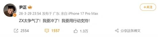 3月29日晚,演员尹正发文:ZX太争气了!我要冲了!我要用行动支持!对此,尹正回应道:“我自己买,不能‘连吃带拿’。”