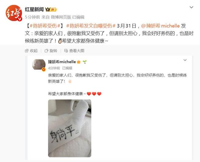 就在工作室发布声明的同一天,陈妍希本人也在个人社交账号发文向粉丝报平安。她的语气显得颇为轻松:“亲爱的家人们,很抱歉我又受伤了,但请别太担心,我会好好养伤的,也是时候练新英雄了!” 文末还不忘提醒大家注意身体健康,并配上了一张“躺平”休息的照片。