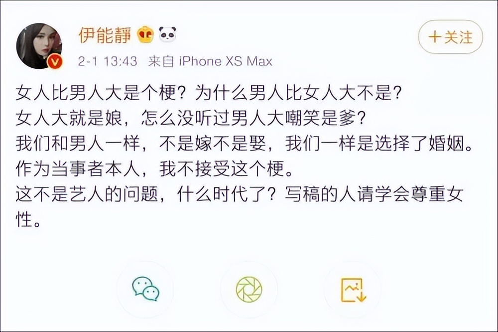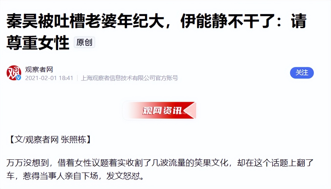 观察者网2021-02-01 秦昊被吐槽老婆年纪大,伊能静不干了,请尊重女性