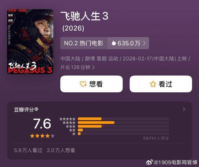 2月18日消息,由韩寒编剧并执导,沈腾领衔主演,尹正、黄景瑜、张本煜领衔主演,魏翔、沙溢主演,范丞丞、孙艺洲主演,段奕宏特邀主演,张新成、胡先煦、李治廷、白宇帆、周政杰、高华阳特别出演,贾冰、王安宇、陈永胜、冯绍峰友情出演的《飞驰人生3》豆瓣开分7.6分。