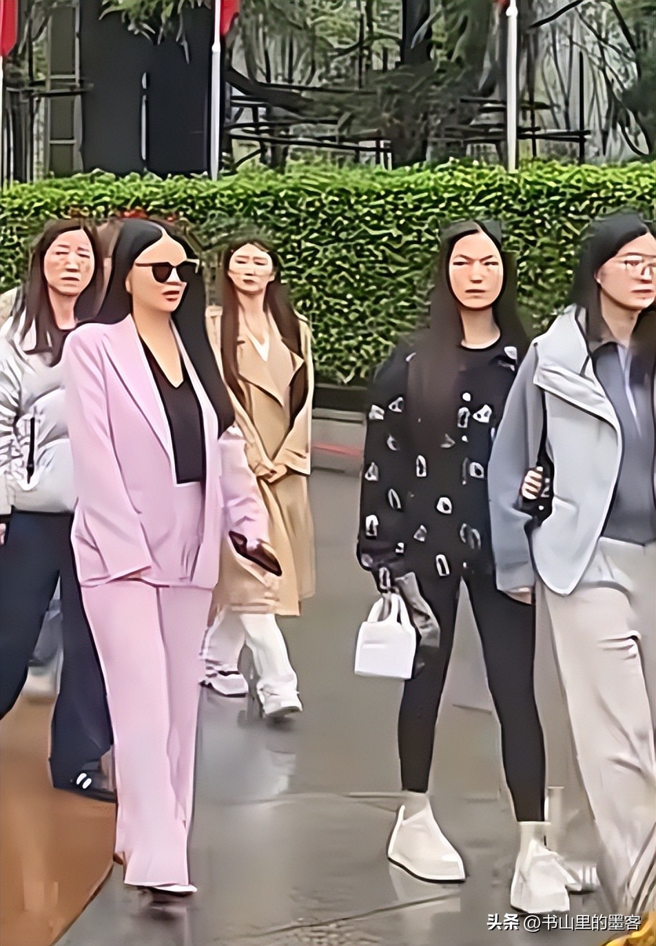 大老远一看,现场的氛围庄重肃穆,周围人大多素衣简装,李湘却一身粉色休闲西装,搭配黑长直与墨镜,在人群里格外扎眼。