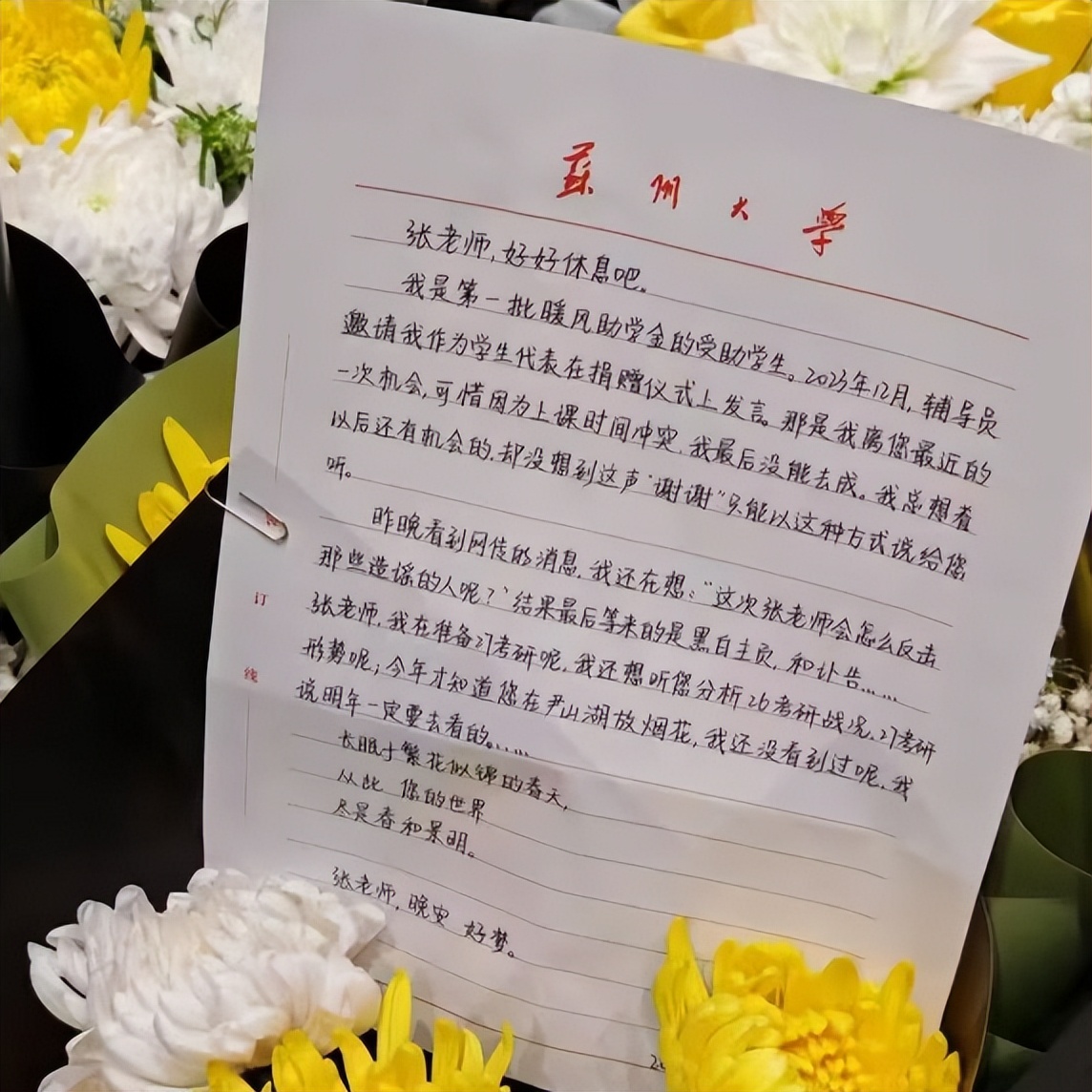 有的学生拿着自己毕业证,有昔日被他资助的学生在鲜花上贴了一封手写信。