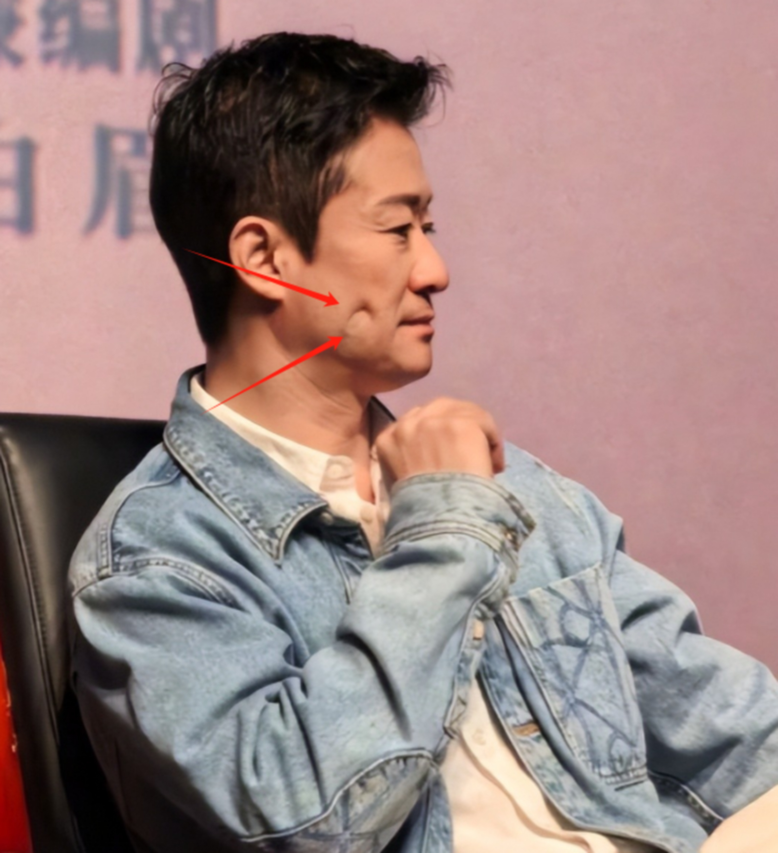 其身穿白色衬衣外搭牛仔外套,或许是最近活动太多,略显疲惫。