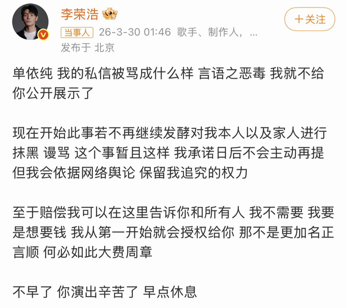微博上,有网友扒出一个细节:后续不少商演的歌单里,《李白》依然赫然在列。虽然单依纯表示会全面停止演唱这首歌,但这里藏着一个耐人寻味的信号——如果不是李荣浩这次公开喊话,这首歌大概率还会继续唱下去。