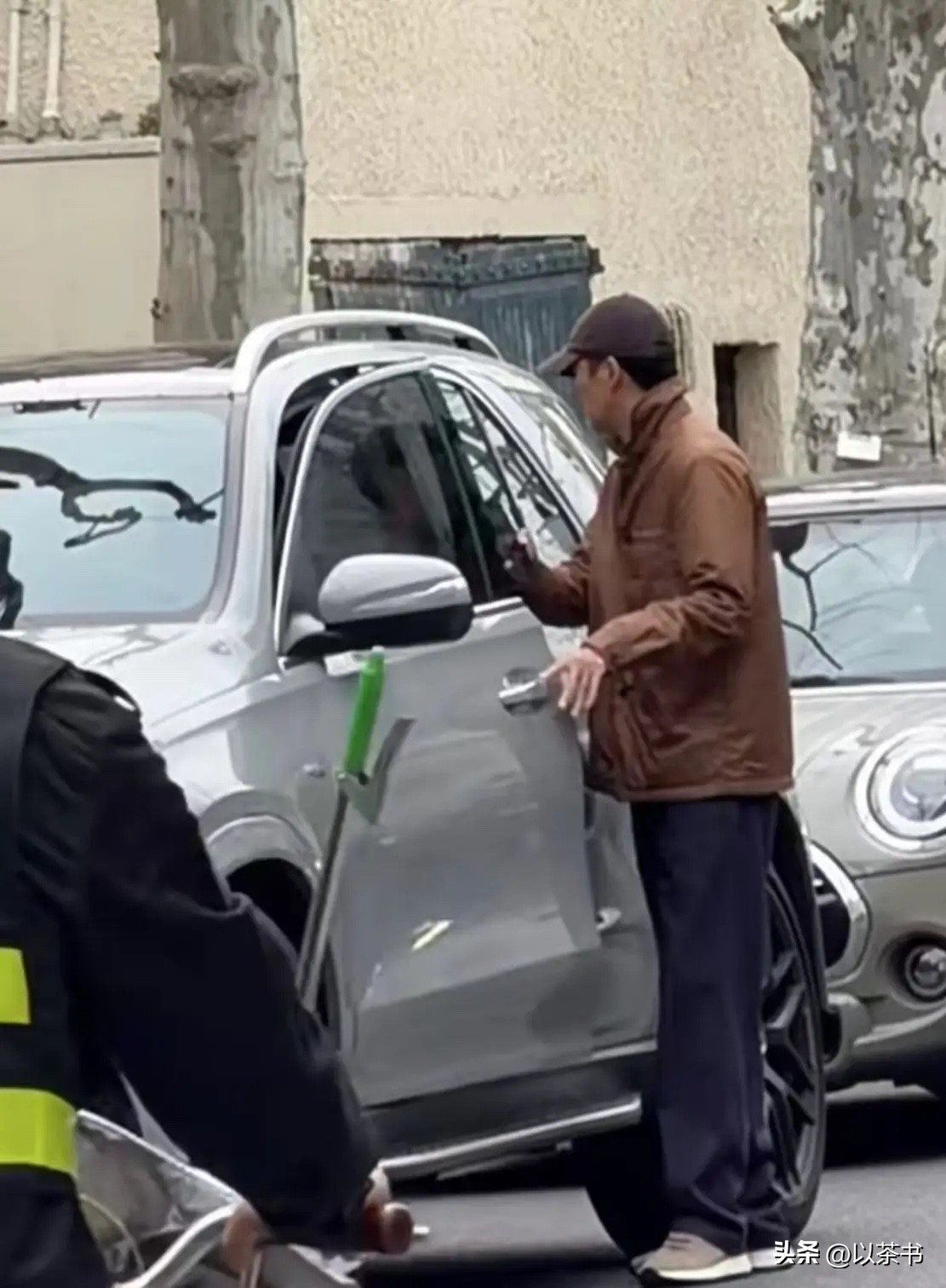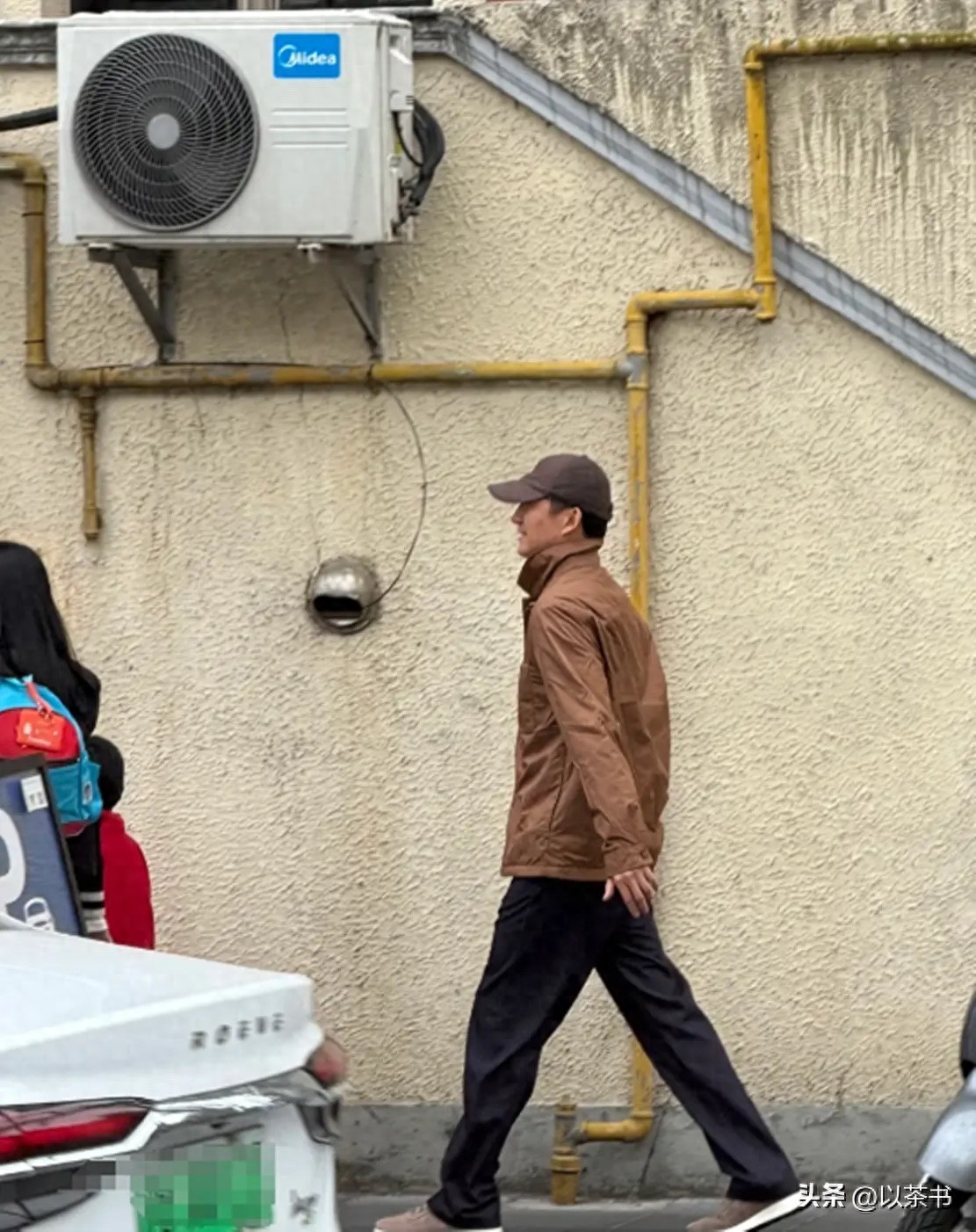 照片里的他穿着棕色夹克配黑裤子,脚下一双白底运动鞋,头上压着深色棒球帽,整个人混在家长堆里毫不起眼。