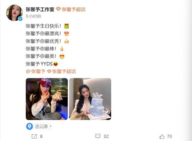 3月28日是张馨予39岁生日,工作室在00:28为其发文庆生,工作室抛出两张张馨予不同状态下手捧蛋糕的照片,配文更是有意思,全是对张馨予的崇拜和赞赏:张馨予你最漂亮,你最优秀,你最棒,你最美,你是YYDS。不得不说工作室的这生日祝福画风很是奇特,和其他工作室相比完全是搞笑赛道里的王者。