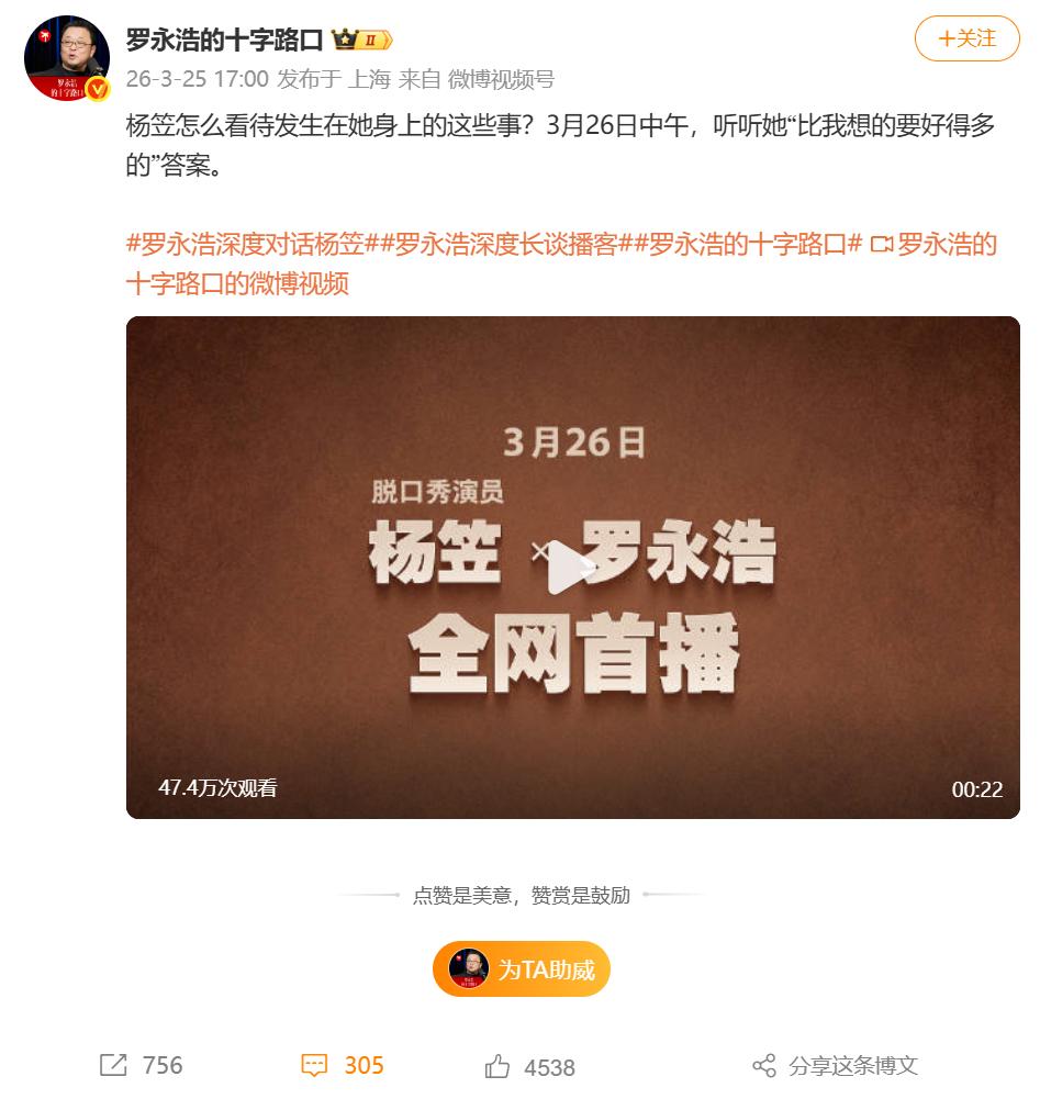 在这条微博中,他表示:杨笠怎么看待发生在她身上的这些事?3月26日中午,听听她“比我想的要好得多的”答案。