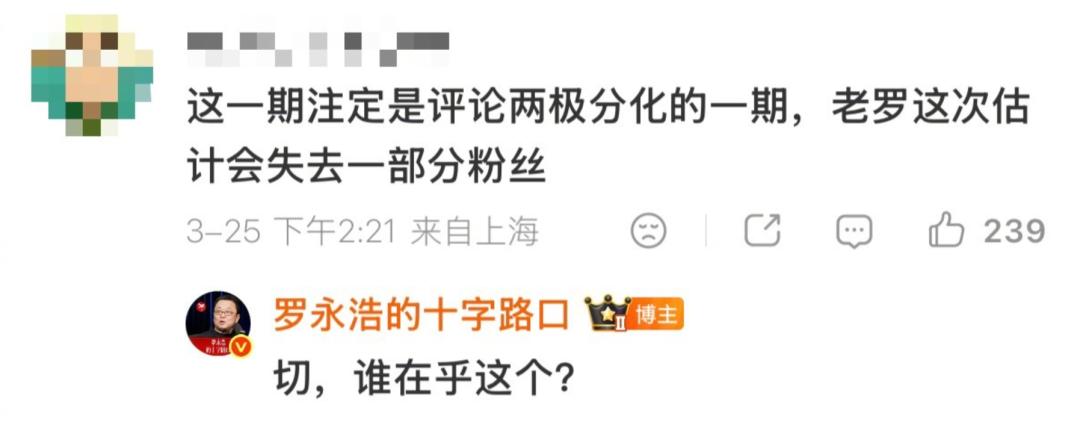 面对铺天盖地的质疑和“掉粉警告”,罗永浩的反应一如既往地硬核。他轻飘飘回了四个字:“切,谁在乎这个?