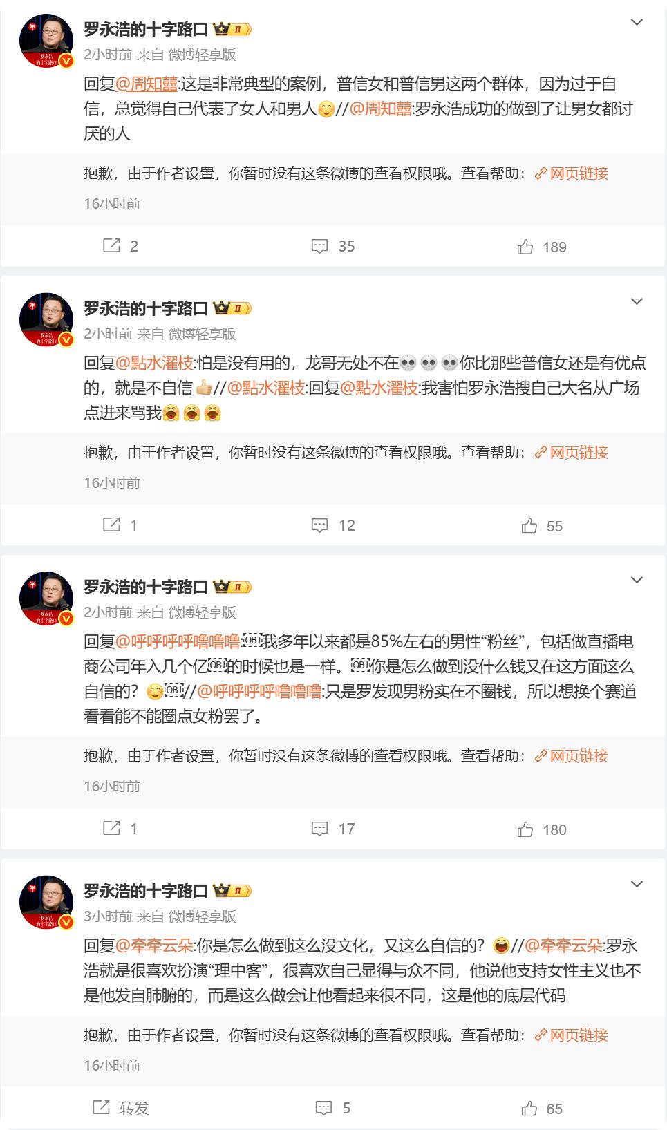 接下来几天,罗永浩持续在微博上与网友对线。有网友说他请杨笠是“愚蠢的昏招”,会得罪潜在消费者。他根本不理这套说辞,继续硬刚。