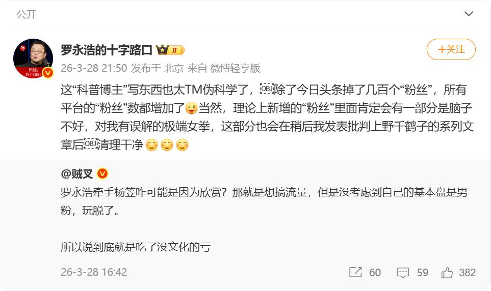 对此罗永浩嘲讽道:“这‘科普博主’写东西也太伪科学了, 除了今日头条掉了几百个“粉丝”,所有平台的“粉丝”数都增加了。当然,理论上新增的“粉丝”里面肯定会有一部分是脑子不好,对我有误解的极端女拳,这部分也会在稍后我发表批判上野千鹤子的系列文章后清理干净。”